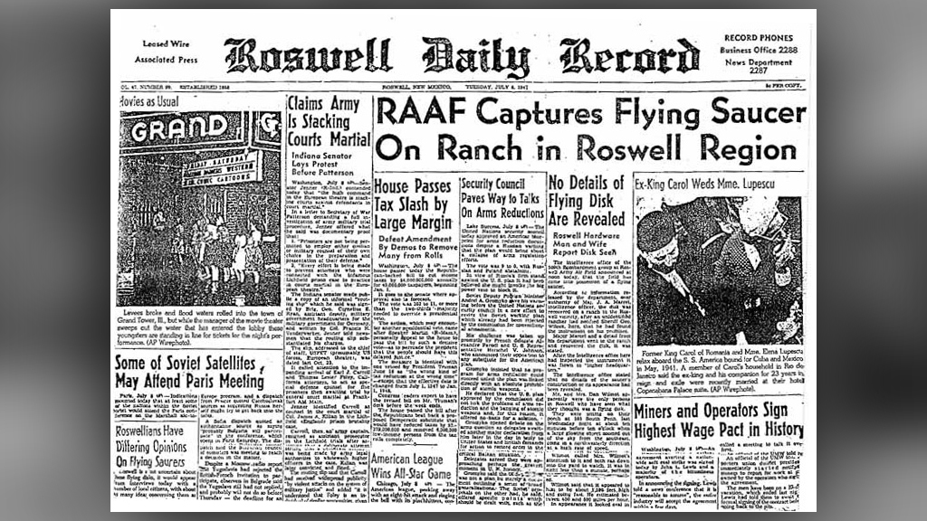 • Pe 8 iulie 1947, RAAF trimite un comunicat de presă: „Forțele aeriene au recuperat un disc zburător în apropiere de Roswell.” Titlurile din ziare fac imediat senzație.